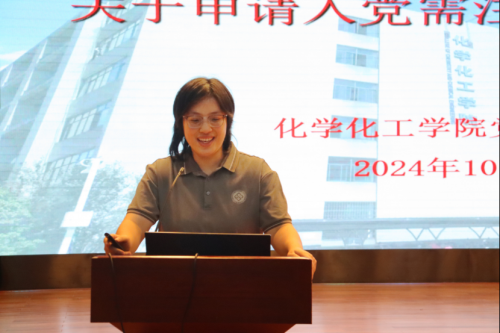 然后,汪菁垚老师对学院党委、学生党建工作、学院阵地建设情况进行了简要介绍,并着重讲述了入党流程及学生申请入党的注意事项。她表示,希望同学们在思想上和行动上都能积极向党组织靠拢,争取早日成为中国共产党的一份子。