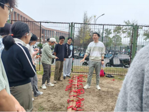 正式活动以分组闯关比拼为主要内容,关卡分为“齐心协力跑”“稳过木桩”“二人成行”“接力传球”四个板块,极大地考验着队员的凝聚力和协调性。活动伊始,参与的成员被分为三个队伍,由赵元超老师介绍游戏规则与注意事项。随后,各个队伍有序展开了练习与热身,在一番汗水挥洒的演练和周密的统筹安排后,比拼正式开始。