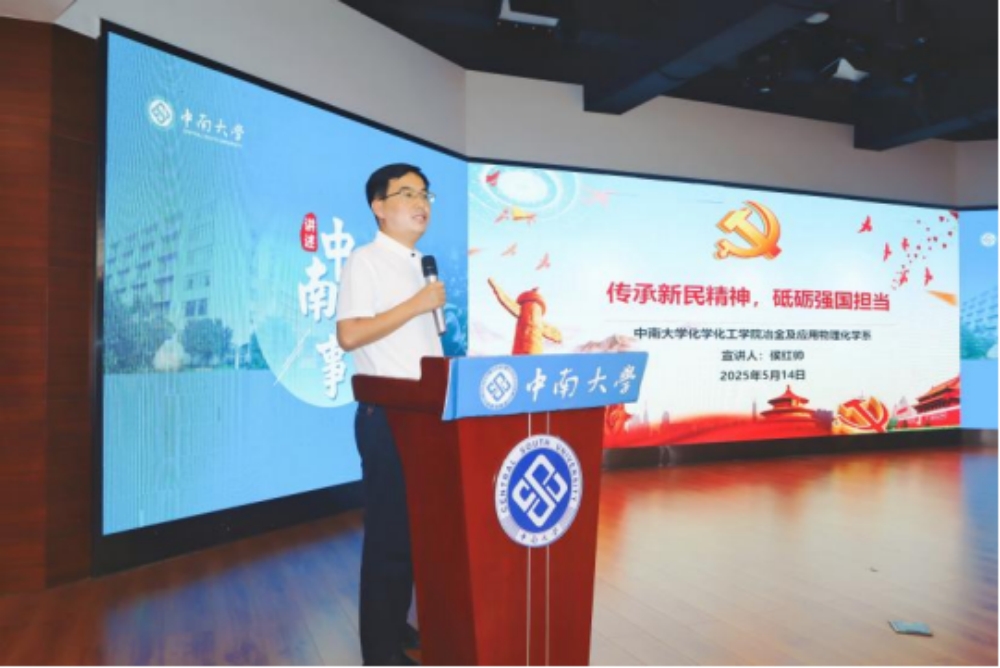 “陈新民院士毅然回国,筹建中南矿冶学院,开创冶金物理化学专业,被誉为‘有色之师’”“陈启元教授传承父辈精神,投身教学改革”“青年学者纪效波博士学成归国,在低成本钠离子电池领域取得重大突破”……侯红帅教授分享了新民精神的传承足迹,真实的故事和生动的讲述让现场师生深受触动,“近年来,冶金物化系党支部入选了全国首批‘双带头人’教师党支部书记工作室,我们将继续弘扬新民精神,在教学、科研与人才培养的道路上砥砺前行。”