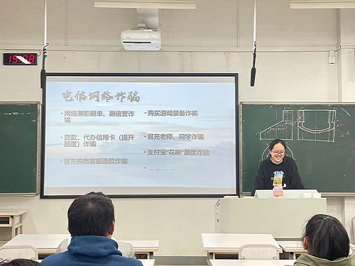 近段时间,电信诈骗案持续高发,案值巨大,犯罪手段主要表现为网上投资、网上刷单、网上借贷款冒充qq好友等。班长通过身边同学的案例向大家讲述一些电信诈骗的手段,希望大家以此为戒,谨防上当。网络发展日趋快速,诈骗手段也越来防不胜防,越来越高明,陌生号码发来的短信链接不要点开,不要随意透漏自己的身份信息。只有当每个人的安全防范意识都有所提高时才能从根源解决网络诈骗问题。随后播放了一条关于各种诈骗手段的针对人群和作案手段,向同学们敲了个警钟。