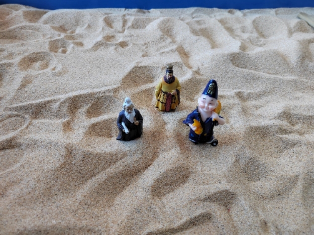 接着进行游戏活动第二项——“人生”。根据滕老师的引导,将全班同学分为两组,每一个同学有三次机会,依次轮流选择一个摆件放在沙盘里。这是一个团队协作的游戏,在每个人选择完自己的摆件之后,都会或多或少地影响接下来同学的选择,而别人的选择也可能会为自己下一轮的选择造成一定的影响。大概十分钟过后,两组同学都完成了自己的作品,每一位同学都分享了自己所选择的摆件的意义以及摆放顺序的含义。