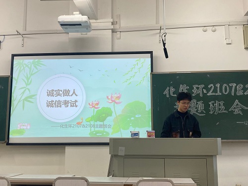 为使同学们了解作弊危害,明确考试规则,清楚纪律处分条例,助力同学们完成入大学以来第一次考试,化生环2107及2108两班学委于2021年12月14日星期二组织了此次诚信考试宣讲班会,呼吁两班同学诚信考试,诚实做人。