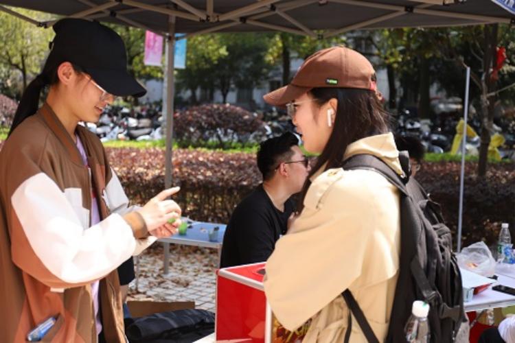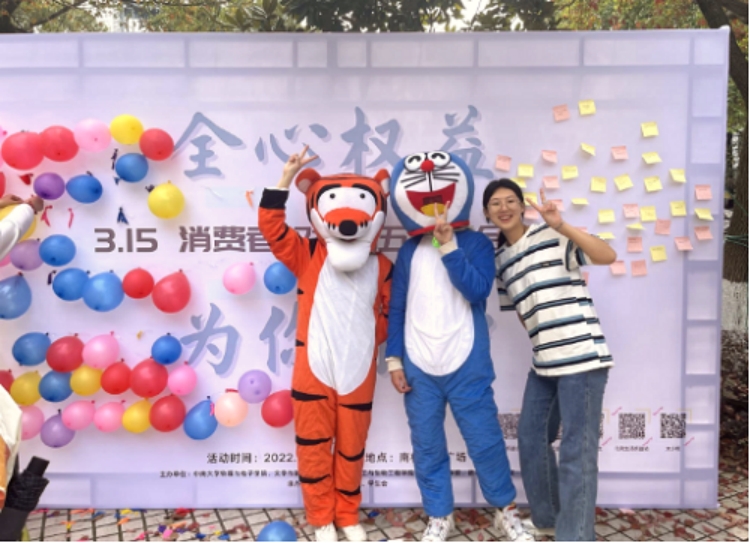 本次活动采用线上线下相结合的方式,共设置“活动卡片发放及线上印章兑换”、“心愿墙留言”、“消费情景炸弹”、“趣味敲冰块”和“印章兑换”五个精心准备的环节。同学们纷纷驻足观看并积极参与,更有与人偶进行合照等互动,将活动气氛推向高潮。