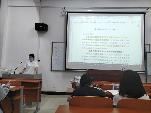 接着,班长就学生工作部于3月14日写给全体中南学子的一封信所传递的精神,给同学们做了细致明确的解读。她强调全体中南学子首先要做到的便是提高认识,凝心聚力,增强疫情防控意识。就是要认识到当下的疫情形势仍十分严峻,切忌存有侥幸心理和松劲心态,坚决克服麻痹思想和厌战情绪。