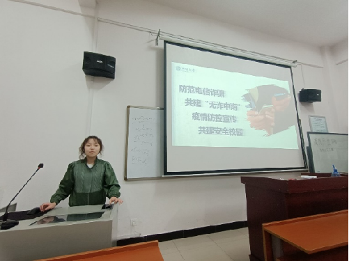 会议伊始,班长张琼向同学们仔细讲述了电信诈骗的具体信息及特征。随班会开展,张琼认真分析了近期校内外出现的诈骗事件,罗列出诈骗类型及涉案金额,积极开展反诈宣传工作。此外,张琼还呼吁同学们安装“国家反诈中心APP”利用自身可利用方式参与反诈防骗斗争中。