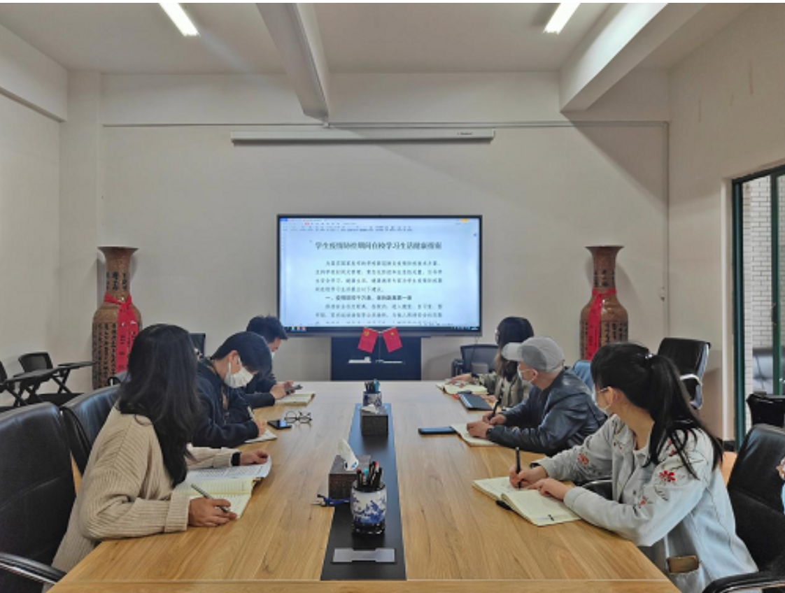 学工办全体老师围绕《中华人民共和国传染病防治法》、《高等学校新冠肺炎疫情防控技术方案(第五版)》、《教育部办公厅关于印发的学生疫情防控期间学习生活健康指南的通知》、教育部办公厅关于印发《学校教职员工疫情防控期间行为指引(试行)》的通知,四个文件内容展开学习交流,结合自身所带年级学生实际情况进行防疫相关应对策略研讨。