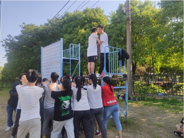 随后,“翻越毕业墙”活动也得以顺利展开。同学们要充分协商、互帮互助地爬上约4.2米高的“毕业墙”。依靠墙底同学的人梯支撑和墙顶同学的有力拉拽,最终全班同学全部完成了翻越!