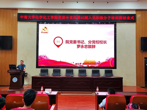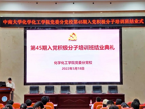 2022年5月18日下午,化学化工学院党委分党校在化学楼133报告厅举行第45期入党积极分子培训班结业典礼。院党委书记、分党校校长罗永忠出席并致辞。院党委委员、分党校办公室主任李璞及培训班全体学员参会。结业典礼由培训班班导师于悦凡同志主持。