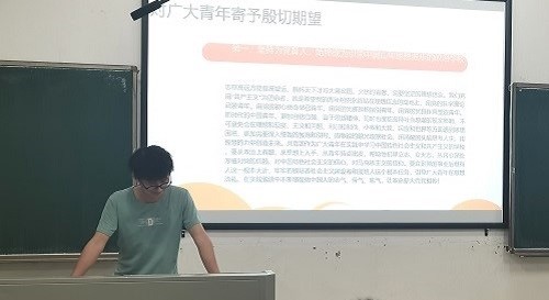 紧接着,黄友同学还与大家共同学习了习近平总书记在庆祝中国共产主义青年团成立100周年大会上的重要讲话精神。习近平总书记在大会上表示,青年之于党和国家而言,最值得爱护、最值得期待。青年犹如大地上茁壮成长的小树,总有一天会长成参天大树,撑起一片天。青年又如初升的朝阳,不断积聚着能量,总有一刻会把光和热洒满大地。党和国家的希望寄托在青年身上!