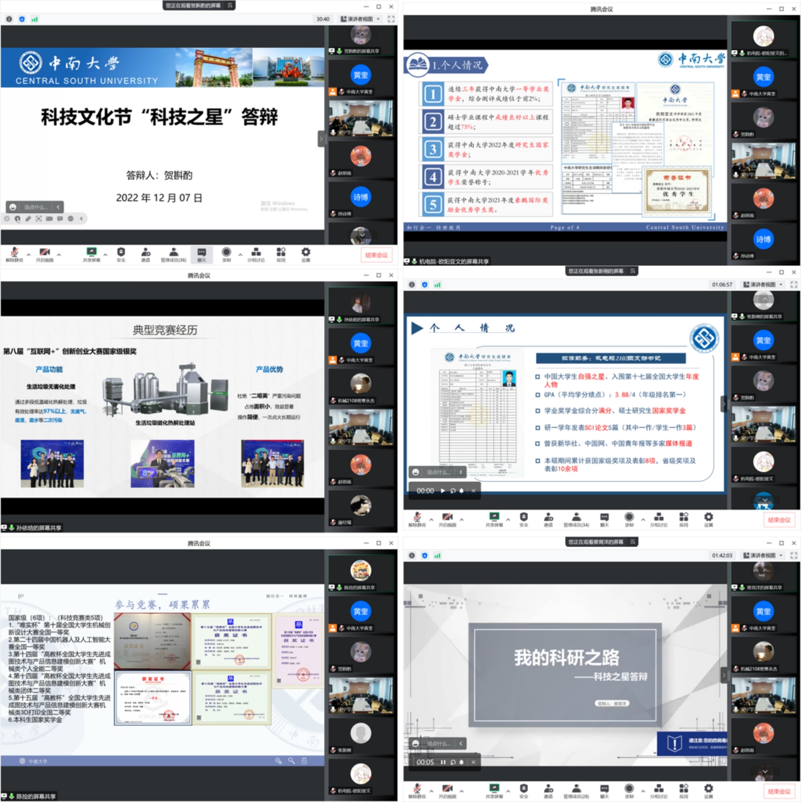 12月7日下午15:00,机电工程学院第七届“璇玑”科技文化节科技之星评选答辩在机电楼C202举行。出席本次答辩的专家评委有黄凯副书记、廖平教授、何玉辉教授、赵海鸣教授和宋佳楠老师。十名科技之星候选人以及四十余名本科生通过腾讯会议参加。