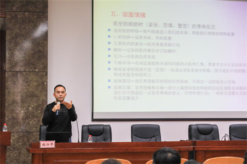 随后,学工部张江华副部长进行“学生干部情绪管理与压力应对”专题报告。张部长以案例分析的形式向同学们说明了情绪管理的重要性,并从生物学、中医学方面向班长们讲解了情绪的起源及其与疾病的关系,讲授了科学的情绪管理方法,他强调要解决情绪问题首先要正视情绪。最后张部长在现场分享了几个疏导情绪的实用方法,建议同学们调整自身需求,科学管理好自身情绪。