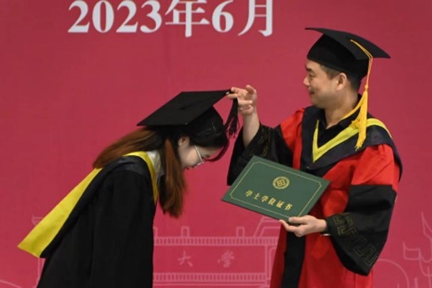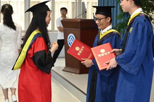 在学位授予环节,各位教授先后为毕业生拨穗正冠,颁发学位证书,进行合影留念。帽上的流苏从右边拨到了左边,它象征着麦穗的成熟,代表着学生们已学有所成,即将展翅高飞。