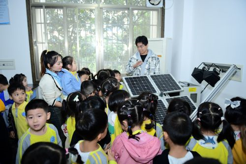 活动开始,新能源本科生高俊杰以太阳能实验平台为依托,向小朋友们介绍光伏发电的原理和作用,还向小朋友们普及能源的概念。