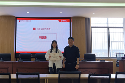 随后,赋能学社进入辅学义工聘任仪式的环节,为共计25位院级辅学义工颁发聘书和徽章。紧接着是辅学义工表彰仪式,为上学期每位辅学义工认真负责地准备课件、讲授知识,在力所能及的情况下帮助其他同学提升成绩,进行表彰与肯定。其中19名优秀辅学义工由伍旺老师颁发证书和1名特级辅学义工李璐婕同学由王洪才老师颁发证书。