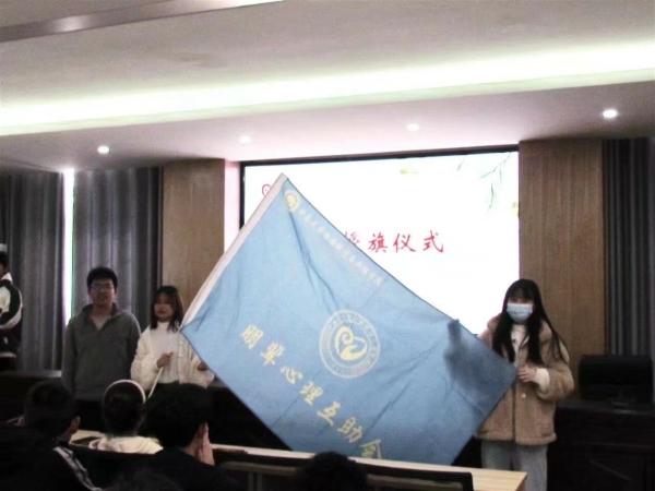 接下来主持人宣布换届大会开始,汤老师上台致辞,他对朋辈心理互助队伍以往的工作给予肯定,并激励心助会全体成员满怀热情去温暖更多的人。大会对一年来心助会表现突出的部门和个人给予表彰,对他们一年的辛勤工作表示鼓励和认可,并为新部长颁发聘书,期望新任部长们以丰富的工作经验和踏实的工作态度感染带动新生力量。接下来,汤老师为本届心助会会长李超授予会旗,传递了心助会的责任与使命。最后,全体心助会成员合影留念,至此,换届大会暨朋辈心理互助技能培训大会圆满成功。