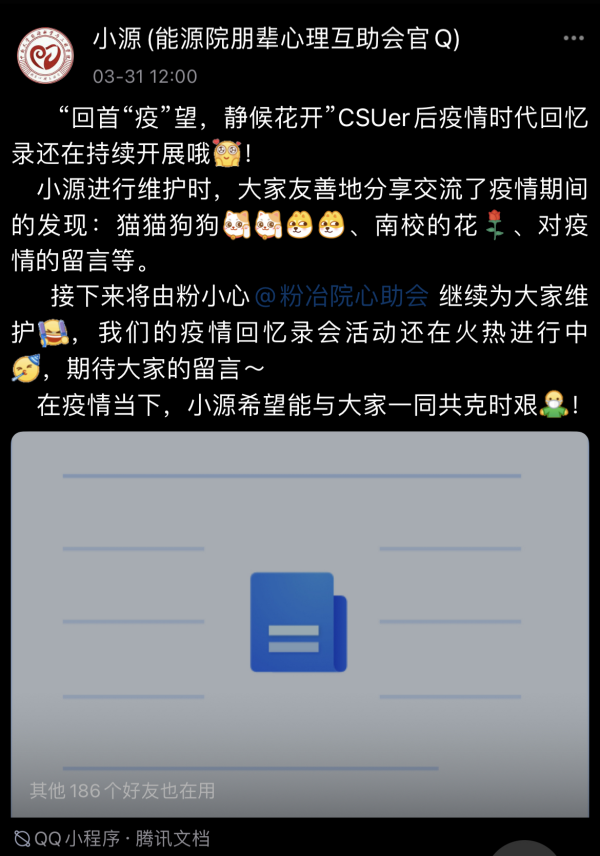 能源院官Q发布预热说说和共享文档,同学们热情高涨,积极参与,纷纷配图留言。文档里有中南四季美景:春日玉兰、后湖日出、雪中楼亭、初春飞雪,有心动日常:松雅湖的黄昏、玉带河的夜景、校本部的小猫,还有五星珍馐:图书馆的餐厅、后湖的外卖、麓山南路的小吃……由于疫情限制,同学们不能外出,但这并不能阻挡我们对生活的热爱,我们对美好生活的回忆不会褪去,向往的将来也一定会到来。