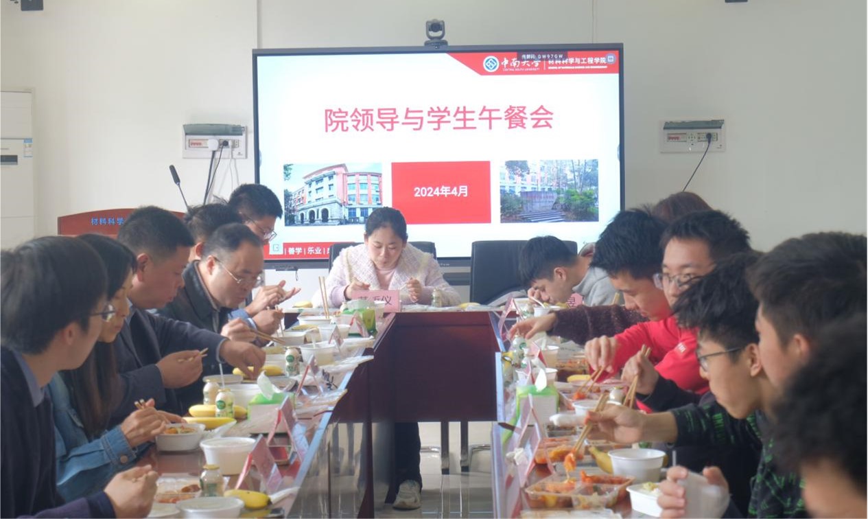 4月9日,william威廉英国官网材料科学与工程学院举行“院领导与学生午餐会”。学院党委书记王新平、党委副书记彭春丽,副院长刘华山、李志明、吴壮志,业务办主任张红媛,院团委书记张彦隆,本科、研究生学生代表十余人齐聚特冶楼229,同进午餐,共话发展。