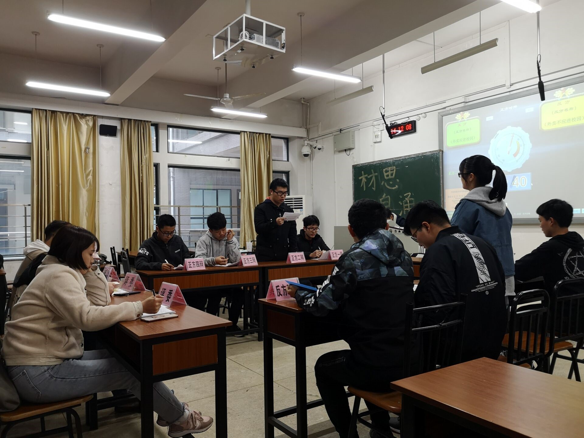 本次辩论赛的论题为“外卖是否应该进校园”,正方持外卖应该进校园的观点,反方持外卖不应该进校园的观点,共三场辩论。第一场13班与6班为正方,对阵1班与8班;第二场12班与14班为正方,对阵9与10班;第三场国际1、2班为正方,对阵7班与11班。
