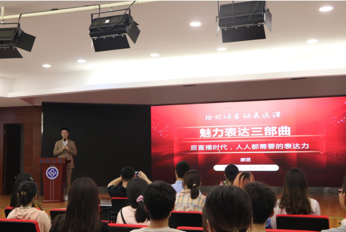 3月13日下午,第一期课堂在毓秀楼演播室如期举行,知名演讲与口才导师、舞台剧制作人廖涯老师为同学们带来一场实用有效的演讲口才培训。材料科学与工程学院团委书记张彦隆老师、建筑与艺术学院李卉淼老师、湖南省大众语言艺术究会演讲委主任助理张达到场观摩了本次培训课堂。