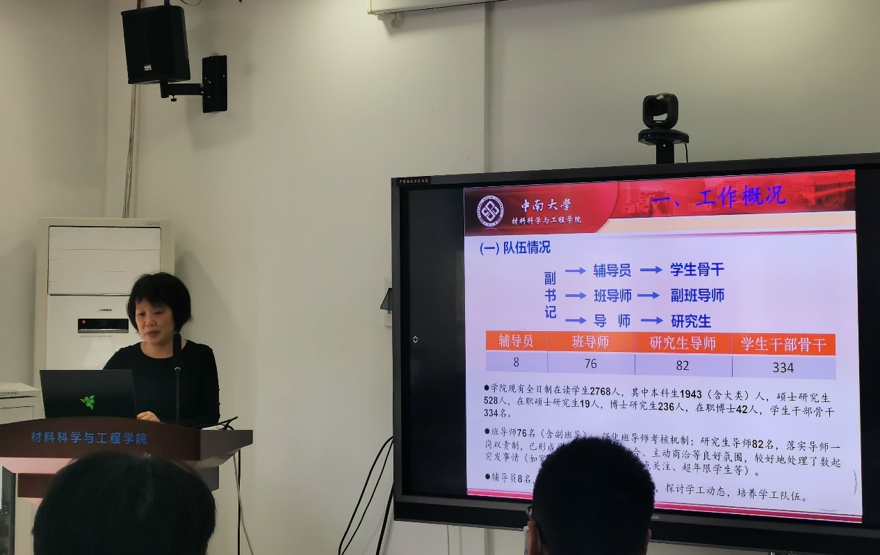 首先,王书记致词,一是欢迎学工部领导及同仁们来学院调研指导,学院将针对问题和建议积极改进;二是感谢学校、学工部多年来对学院学生工作的大力支持和热情帮助。接着,胡小清副书记对材料学院风险排查与重关工作专项工作进行了汇报,详细地介绍了材料院学工队伍在学生工作、风险排查和重关工作等方面所做的努力以及不足。近年来,材料学院坚持念好“特”“精”“准”三字经,构建了“333”安全稳定工作机制和“544”重关帮扶机制,努力健全心理育人与安全稳定“四级”管理体系,将学生心理健康管理与学院的安全稳定落到实处。汇报中还逐一介绍了对问题学生的成功帮扶案例、危机干预案例、在册重点关心学生的情况、新排查即将入库重关学生情况。按照学校的要求,对疫情防控、学业问题、重点关注、网络诈骗、突发事件、请假学生、校外租住、学籍异动等15个具体方面的风险进行排查,并提出相应对策与预案。