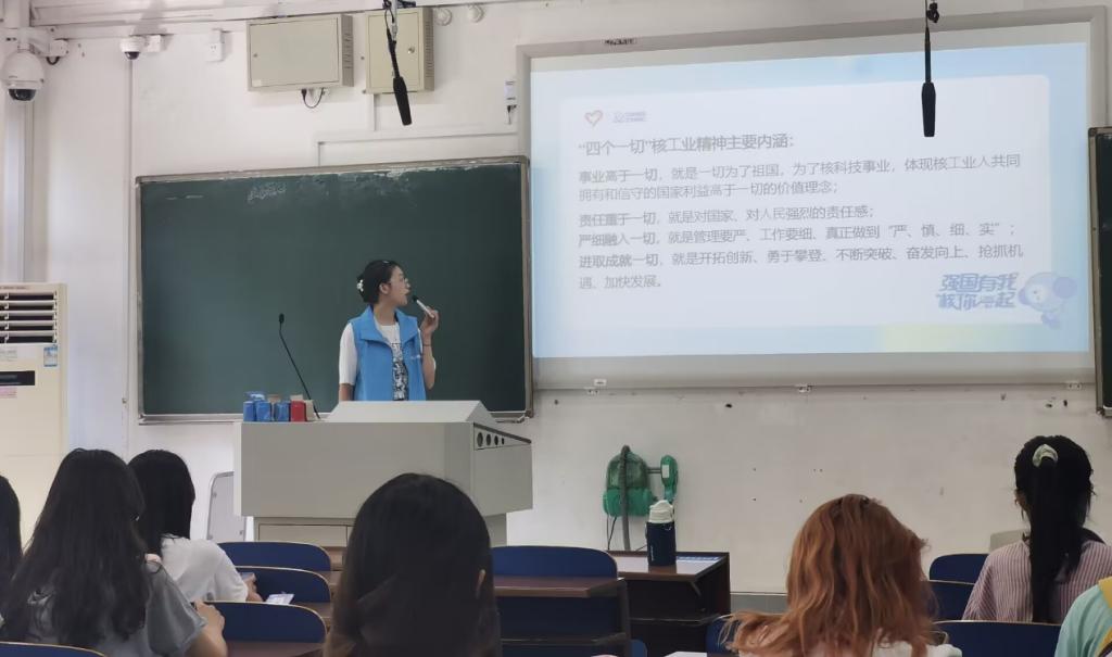 10时30分,“强国有我,‘核’你一起”志愿宣讲团 “一麓湘伴”志愿服务队为支部全体同学进行国防知识宣讲。志愿服务团队围绕宣传贯彻习近平生态文明思想,引导我们广大青年学生深刻认识碳达峰碳中和目标的重大意义。宣传绿色核能发展理念、 “两弹一星”精神,并进行核知识科普。其中讲到的四个一切的核工业精神——“事业高于一切,责任重于一切,严细融入一切,进取成就一切”加深了同学们对核工业的了解,也增强了我们大学生的国防意识和国防观念,提高我们大学生的综合素质,为培养社会主义合格的建设者和可靠的接班人,建设强大国防后备力量奠定基础。