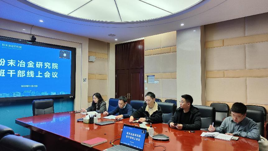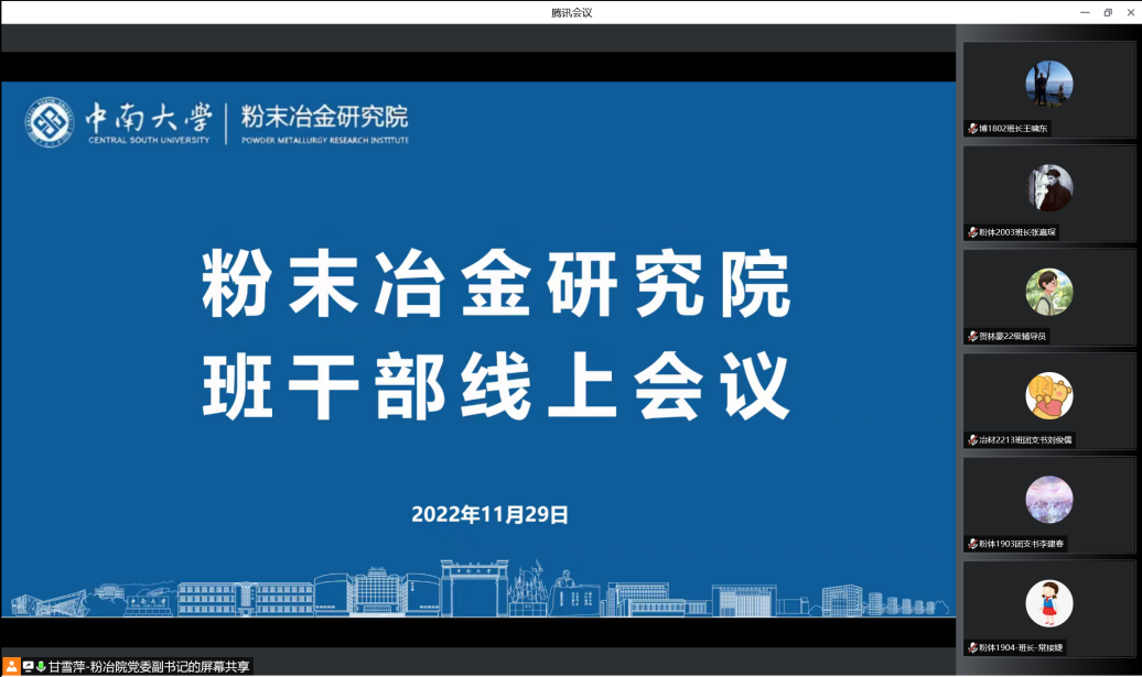 为方便学生管理工作的展开,增强同学们的疫情防控意识并提高同学们的学习积极性,2022年11月29日,粉末冶金研究院召开粉冶院班干部大会。为配合疫情防控工作需要,本次大会采用线上召开的方式,粉末冶金研究院党委副书记甘雪萍、学工办部分工作人员以及粉冶院各班班干部参加本次会议。会议由团委书记张翠老师主持。