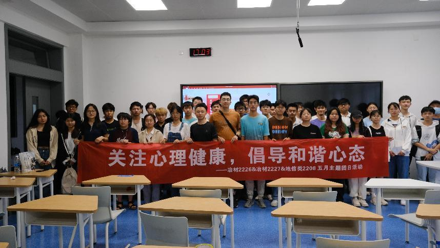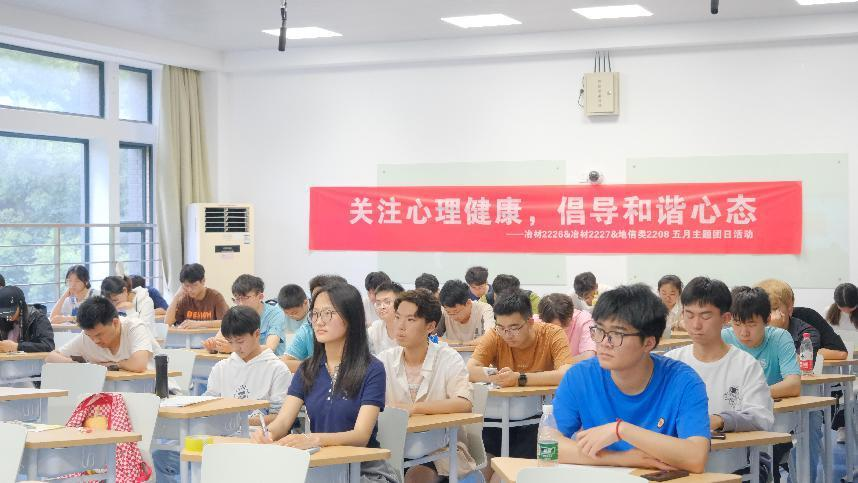 2023年5月14日下午,为促进大学生身心和谐健康成长,冶材2226团支部、冶材2227团支部、地信2208团支部在新校区A座201联合举办了以“关注心理健康,倡导和谐心态”为主题的团日活动。