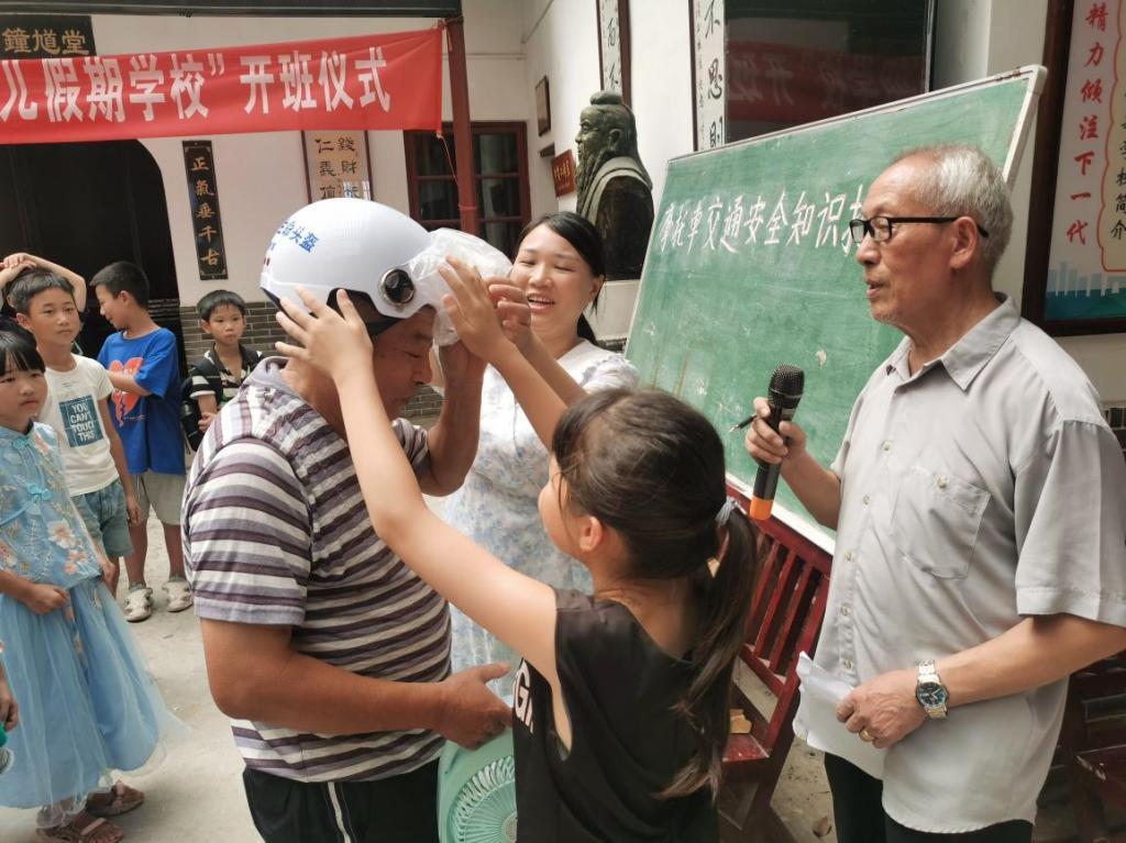 仪式的最后,夏春初校长代表学校为近期表现优秀的同学们及其家长进行表彰,并奖励了他们一顶安全帽。夏春初校长表示,希望本次交通安全知识普及课堂,可以加强石羊塘镇村民的交通安全意识,减少交通安全事故的发生。