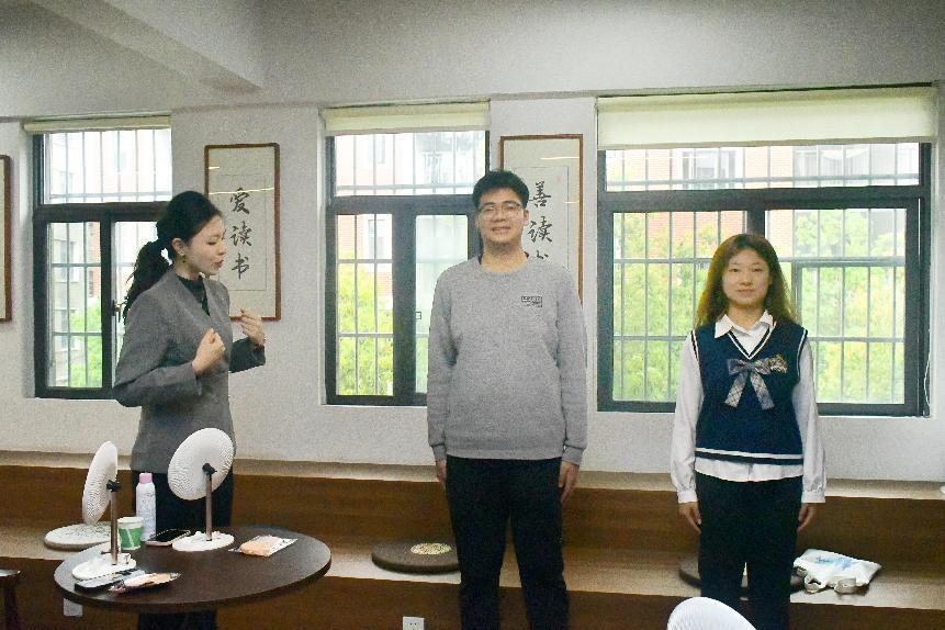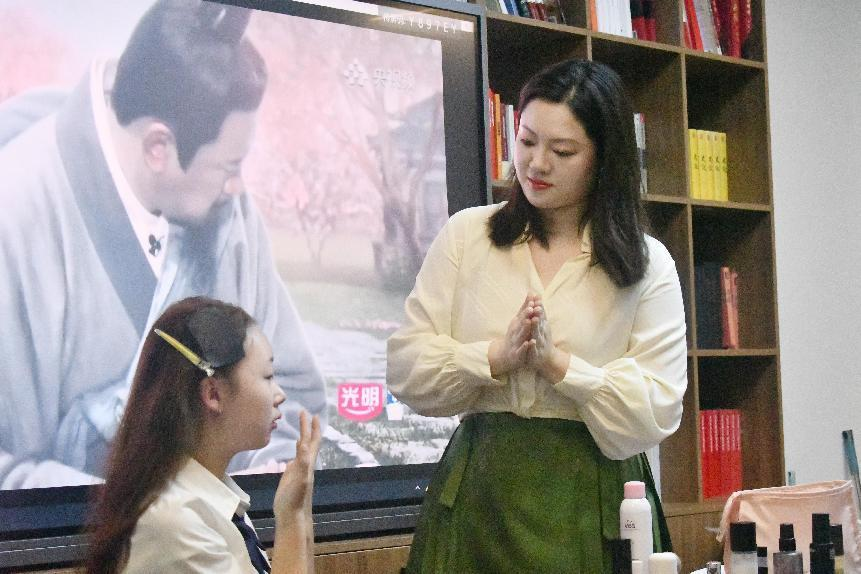 接着,沙龙就形象礼仪与仪态礼仪两部分展开,罗洁婷老师作为国家化妆师职业资格证持证者,从专业角度分析了在场同学的面部特色和适合的着装风格,语言风趣幽默,绘声绘色,现场一片欢声笑语。随后,罗老师邀请本次教学模特上场,针对模特的个人特色,教授同学们上妆手法和化妆过程中的注意事项。李卉淼老师则是根据《礼记》的规范要点结合现代礼仪要求,现场指导同学们坐姿、站姿、行姿、神态、手势等,为同学们塑造更好的形体仪态。