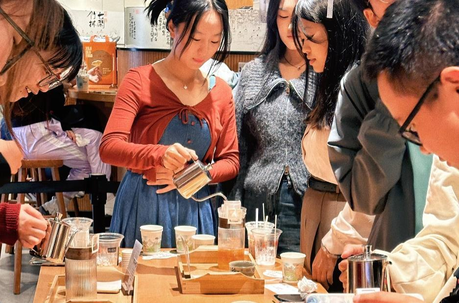 接下来,以高山红茶为例,工作人员亲自示范了冲茶的过程,他娴熟的手法和优雅的姿势收获了大家的声声赞叹。随后,同学们两人或三人一组,跟着工作人员的讲解,先是低冲,由内向外,寓意着对大家表示欢迎;再是高冲,缓缓细流,使茶叶充分舒展开来。大家泡出的茶颜色虽深浅各异,但都茶香浓郁。