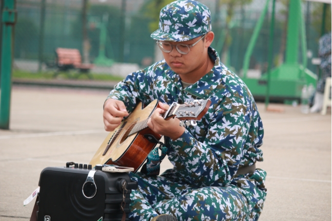 活动在唐语乐同学弹唱的《飞云之下》中拉开序幕,轻柔的吉他声抚平了训练场的疲惫,同学们跟随旋律轻声哼唱。随后,甄灏轩同学以一曲《我们的时光》掀开了军训日记的扉页,歌声中饱含着汗水与坚持,也承载着青春的炽热与真挚。“这就是我们的时光”——当歌词响起,军训的记忆变得鲜活,似乎被汗水浸透的迷彩衣角、一起咬着牙坚持的军姿:都在跟着旋律轻轻晃动,成了青春里最生动的注脚。