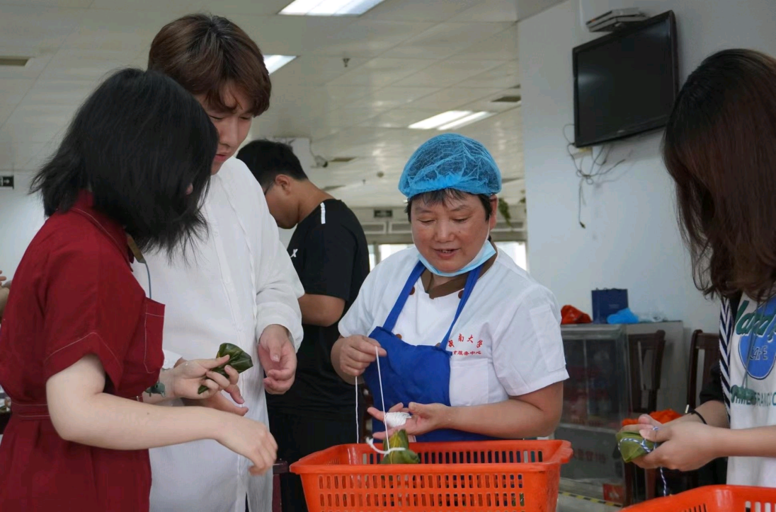 活动伊始,二食堂的阿姨们热情地为大家展示了粽子的几种包法。在阿姨们的现场教学结束后,同学们都迫不及待地开始动手尝试了起来。大家首先拿出事先准备好的粽叶,开始有模有样地折了起来;随后便是向粽叶内加入糯米和馅料。最后,在阿姨们的帮助下,同学们用绳子将粽子扎了起来。经过一个小时的努力,千奇百怪的粽子展现在我们面前,有方形的、菱形的,有豆沙馅的、五花肉的、咸蛋黄的等等。随即大家将粽子带去厨房开始了蒸制。