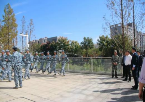 首先,四连连长龚智龙向高广军院长汇报近期军训情况。领导老师们在连长的陪同下走访了各军训方阵,观看了新生的部分军训项目。