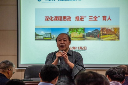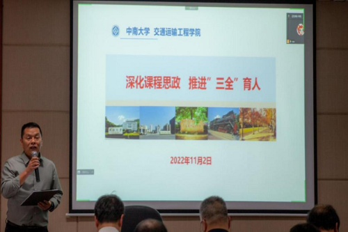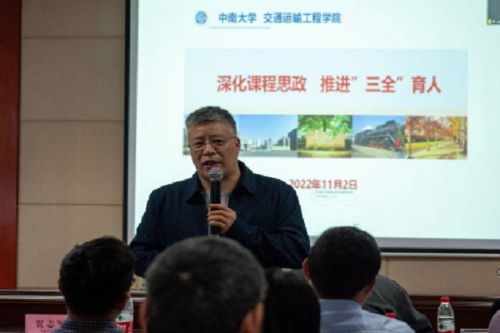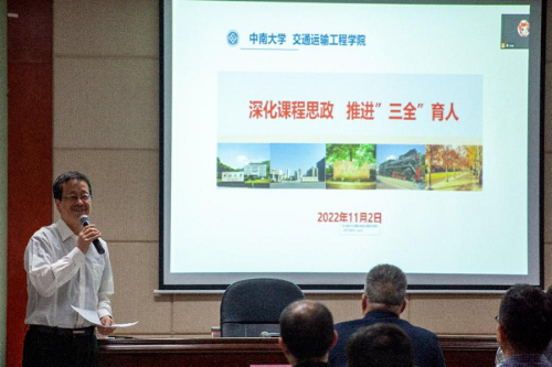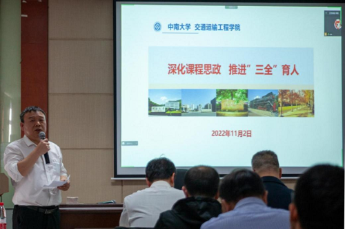 随后,交通院五位老师结合自身在课程思政中的思考与实践进行分享。 湖南省课程思政课堂教学竞赛一等奖获得者李烨老师,从课程思政教学中的常见误区及其内涵谈起,对以课程特色和学科优势深入研究目标的教学方法进行了剖析。 他指出,要将思政元素有效融入到专业知识传授过程中,达到育人的最好效果。 2021年校级思政示范课程代表章易程老师以工程流体力学为背景,将建设内容分层次依轻重进行阐述,提出产出导向的沉浸式因才教学模式和多尺度因才考核模式。 交通院党委副书记宋晓东根据学生工作的特点和学院思政教育的案例,谈及对课程思政建设的看法,号召全体教师发挥特色、明确职责、夯实基础、协同发力,不断利用思政资源,为培养敢想敢为又善作善成的时代好青年共同奋斗。 党委委员叶峻青老师部署了课程思政案例的编写工作,并结合自身参赛的经历,着重阐述了课程思政教学案例的编写方法。 李蔚老师提出课程思政要进行教学创新,深化人才培养,丰富思政案例,精益求精完成思政案例编写工作。