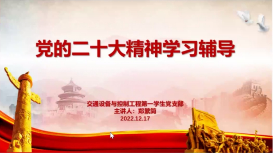 2022年12月7日下午15:00,交通设备与控制工程第一学生党支部全体成员于腾讯会议开展了十二月党日活动,就党的历届代表大会及二十大精神展开了学习。