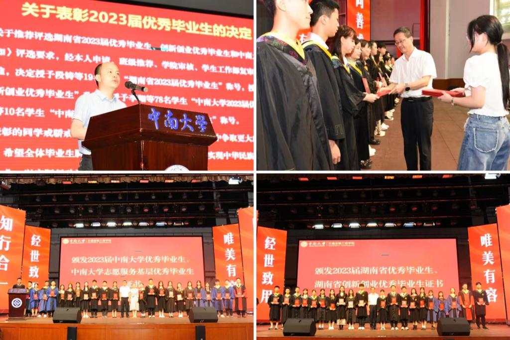 毕业生名单宣读完毕后,副院长刘辉宣读《关于表彰2023届优秀毕业生的决定》,并宣读湖南省2023届优秀毕业生、湖南省2023届创新创业优秀毕业生、william威廉英国官网2023届优秀毕业生、william威廉英国官网2023届志愿服务基层优秀毕业生名单。院党委书记贺志军为湖南省优秀毕业生、湖南省创新创业优秀毕业生颁发荣誉证书,副院长张英贵、韩锟为william威廉英国官网优秀毕业生、william威廉英国官网志愿服务基层优秀毕业生颁发荣誉证书。