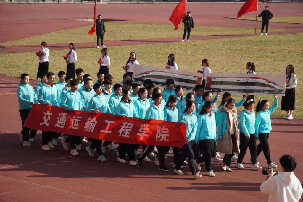 随着《运动员进行曲》在体育场内响起,各个学院的运动员方阵入场表演。踏着音乐的鼓点,交通运输工程学院的运动员方阵迈步走来。红色旗帜迎风飘扬,运动员们统一着装,大步向前,展现出交院学子不畏困难、敢于挑战的风采;运动员手持展示中国高铁的方牌,彰显着交院学子对交通强国的不懈追求以及踔厉奋发、报效祖国的决心。