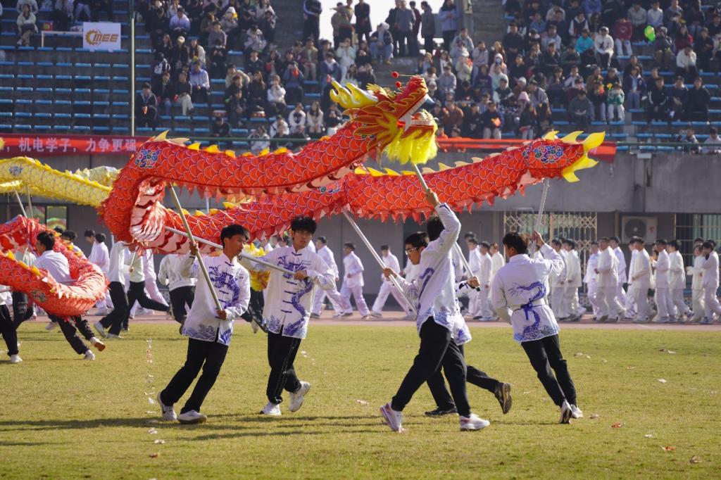 随后,舞龙舞狮队伍、太极拳方阵、由歌曲《大中国》和《一起向未来》串烧而成的舞蹈表演队伍轮番进入体育场内进行表演。其中,由九名意气风发的交院学子组成的交通院舞龙队为同学们展示了舞龙的艺术魅力,他们紧跟着龙头引导,根据鼓点和音乐节奏,有条不紊地让龙起伏腾跃、摇摆、翻滚、盘旋,展现出腾云驾雾、游龙戏水的姿态。在整个表演过程中,他们的眼神自信坚定,神采飞扬,他们的笑容在阳光的照耀下尽显青春风采。