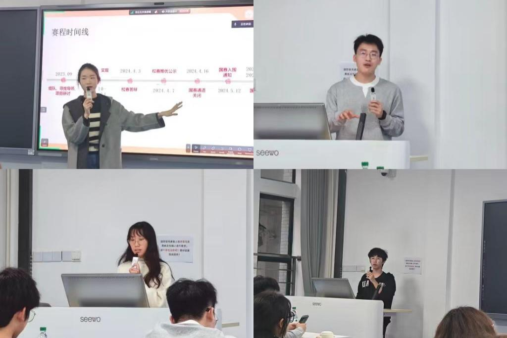 活动伊始,主讲人张心怡分享了她参加交科赛的成功经验,详细介绍了交科赛的信息,分别从寻找导师、课题研讨、项目实现和国赛答辩4个方面介绍了自己的项目经历。随后,下一位主讲人王添乐分别讲解了数学建模的收获,入门数学建模的方法以及数学建模的注意事项。接着,主讲人傅文婷为大家讲解了个人的参赛经历,分析了大英赛的报名情况和获奖比例,进行了大英赛题型的解析,并分享了个人的学习方法。最后,主讲人李蔚翔为大家分享了关于大创比赛的经验。