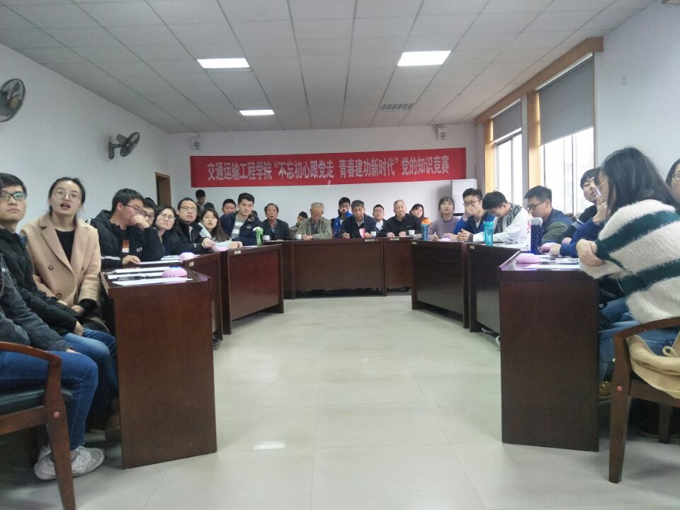 11月18日下午两点半,由交通运输工程学院分党校、关工委和研究生会共同举办的“不忘初心跟党走,青春建功新时代”党的知识竞赛在铁道校区交通楼425会议室举行。铁道校区关工委主任张国强老师,交通院关工委常务副主任戴永宝老师,交通院关工委副主任赵吉山老师,交通院关工委网络宣传员李轶平老师,院党委副书记、院关工委主任凌春雨老师,学院党委委员、学工办主任宋晓东老师,学院党组织干事韩艳老师,学院分团委书记、关工委秘书樊佳俊老师莅临竞赛现场。本次比赛由何丽莹同学和龚浩同学主持。
