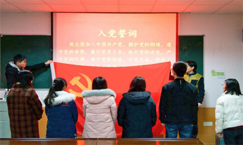 首先进行的是预备党员宣誓仪式。经上级党组织谈话,决定同意接收马思慧,李明伦,李清韵,张素莹,杨旖旎同志为预备党员。面对党旗,在张佳琪书记的带领下,五名同志庄严宣誓。同时,对五名预备党员在党旗下宣誓进行拍照留念,以此增强党员身份认同感和使命感。