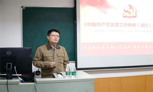 黄老师首先就支部建设谈了自己的看法,他认为支部建设不是说出来的,也不是开会开出来的,而是要一步步去做。只有每个支部与自己专业联系起来,这个支部才能建设得有特色,有活力,有优势。之后他就新发布的《中国共产党支部工作条例(试行)》进行详细解读。