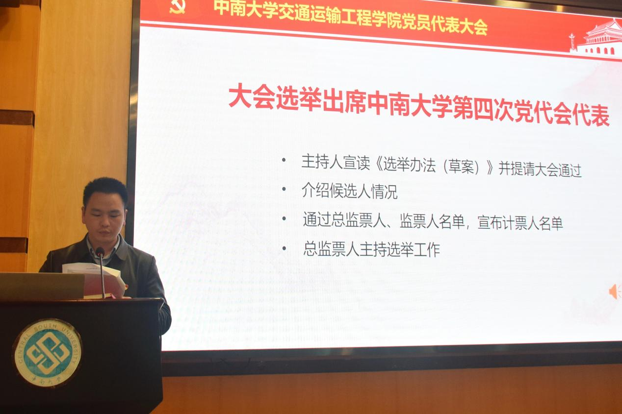 统票期间,学院党委书记贺志军同志作了题为“凝心聚力,奋发有为,引领学院全面发展,高质量建成全国党建标杆院系”的党委工作报告。贺书记在报告中回顾和总结了过去三年的工作:一是以政治、责任、纪律三个导向形成上下联动的合力,二是以党建工作的广度、深度、温度三度夯实党建工作基础,三是以丰富活动内涵、提升时代内涵、强化服务内涵这三个途径打造党建工作平台,四是以培育民主、育人、和谐三个氛围发挥党建服务功能,五是以着力科技研发、师资队伍、人才培养、国力影响、社会服务、学科文化六个发展凸显党建引领作用。随后,贺书记对今后的党建思路和学院的发展工作作了报告:全面推进党建质量提升计划,全面执行党建任务清单化管理,加强党建工作队伍建设,加强分党校建设,全面落实意识形态工作,持续推进科技创新能力提升计划,持续实施国际影响力提升计划,持续推动与国铁集团、中国中车等轨道交通企业的战略合作。最后,贺书记还号召全体党员保持奋发有为的精神状态,提高推动学院科学发展的能力,脚踏实地,改革创新,为建成具有中南特色的全国党建工作标杆院系、交通运输工程一流学科而努力奋斗。
