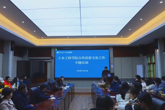 为深入学习贯彻习近平总书记对宣传思想文化工作作出的重要指示精神和党的二十大对新时代新征程宣传思想文化工作作出的重要部署,进一步提高学院宣传思想文化干部队伍工作能力,12月15日上午,土木工程学院在世纪楼14楼会议室召开了宣传思想文化工作专题培训会,学院党委副书记纪晓飞,学院党委委员、副院长乔世范,系所主任、支部宣传委员、主要宣传干部等参加了此次培训会。培训会由学院党委委员、副院长乔世范主讲。