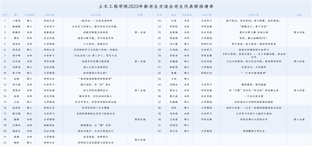 土木工程学院“一对一,共成长”志愿服务项目历经七年,弦歌不断,历久弥新。12月24日下午,土木工程学院2023年新老生交流会暨“一对一,共成长”志愿者见面会在新校区A座教学楼A101,A104等八个会场顺利开展,学院本科2023级全体同学,42位老生代表、一对一志愿者、新生班级班导师、学办各年级辅导员共同参与。