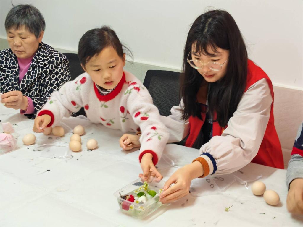 竖蛋之后,活动便来到了染蛋环节。志愿者们详细介绍染色方法和注意事项,并提供彩绘模板供参与者参考。现场居民们自由发挥创意,使用不同树叶或鲜花,用颜料在硬壳鸡蛋上进行创意涂鸦、装饰,打造各具特色的彩蛋。志愿者将提供食用染料和传统染色技艺,结合居民自带的花草染料,让大家亲手体验古法染色的乐趣,学习传统文化的魅力。染色过程中,一些爷爷奶奶也分享起了以往春分的习俗,大家都话起了家常,现场氛围轻松愉快又温馨。在志愿者的一对一指导下,居民们都亲手制作出了属于自己的独一无二的彩蛋。