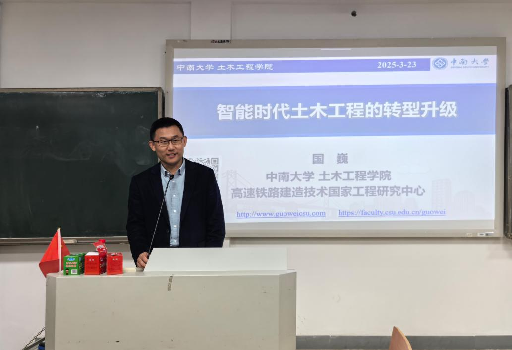 为强化新生职业发展认知,助力学生把握智能时代行业发展动向,2024级土木安全类于3月23日上午在潇湘校区A座教学楼110教室举办“智能时代土木工程的转型升级”主题交流会。本次交流会由土木工程学院副院长、高铁国家工程中心常务副主任国巍教授主讲,近百名2024级学生参与交流。