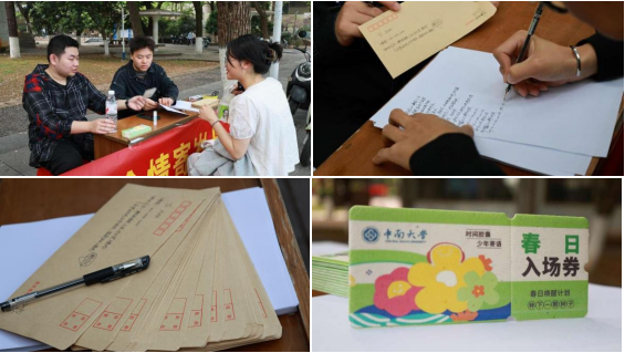 工作人员在攀登楼前设置了“时空胶囊”收集点,参与活动的同学们在信纸上郑重写下对未来的寄语,并将其封存于信封当中。他们有的正因面临升学和求职的选择而感到些许压力和迷茫,有的即将毕业离开学校而感受深深不舍。一位大三的同学前来投递信件的时候笑着说:“希望一年之后收到这封信的时候,现在的目标都已经实现了!”