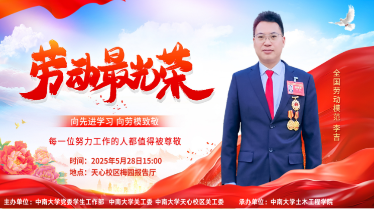 恰逢劳动教育主题月,5月28日下午,土木工程学院 “传承匠心·青春同行”全国劳动模范事迹报告会在天心校区梅园报告厅举行。全国劳动模范、中央企业优秀共产党员、全国青年岗位能手中铁五局高级工程师李吉以亲身经历向400余名青年师生讲述“逢山开路、遇水架桥”的奋斗故事,用劳模精神点燃青春理想,以实干信仰回应时代之问。这场跨越年龄的专业对话,不仅是一场事迹分享会,更是一堂生动的“人生思政课”。
