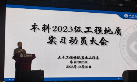 10月26日下午,土木工程学院本科2023级工程地质实习动员大会在铁道学院大礼堂顺利举行。岩土工程系主任陈晓斌教授出席,地质实习带队教师、本科2023级辅导员、400余名学生参与,会议由本科2023级辅导员潘文彬主持。